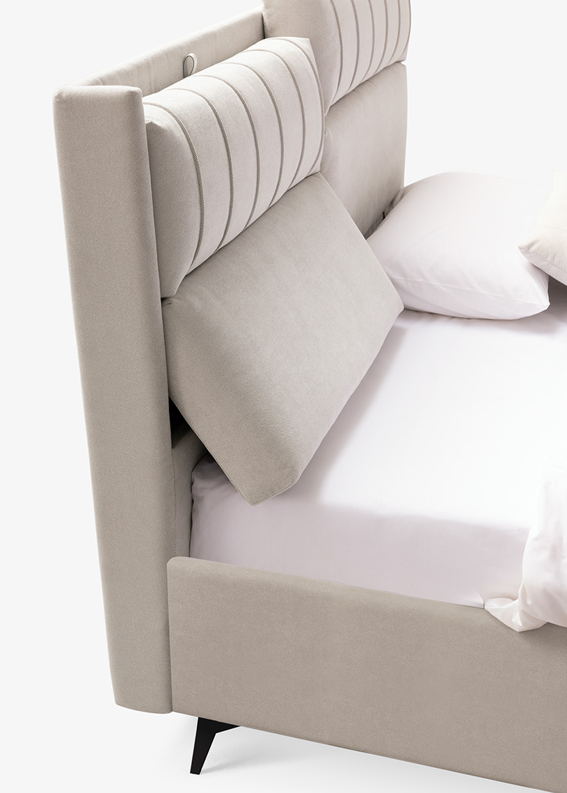 The comfort of the soft cushions on the height-adjustable headboard cocoon you during moments of relaxation. A storage compartment is located inside the headboard.