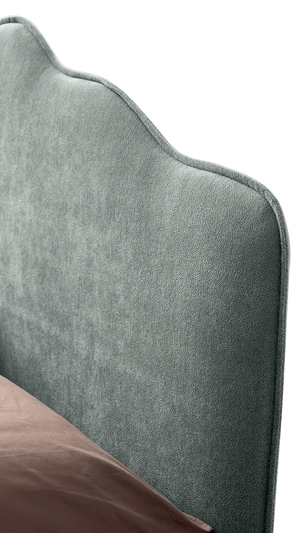 Detail of the headboard featuring rounded and sinuous lines with a perimeter piping.