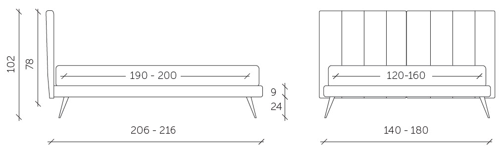 Bed base integrated into the frame, and is available as standard both in 160 cm double and 120 cm small double versions; the extendible joints between the bed base and the headboard, which can be lengthened by up to 10 cm, enable mattresses from 190 cm to 200 cm in depth to be used (in the version with a 190 cm bed base) or mattresses from 200 cm to 210 cm in depth in the version with a 200 cm bed base. In the “structural bed base” version, different feet are available as an option: wood, and metal.
