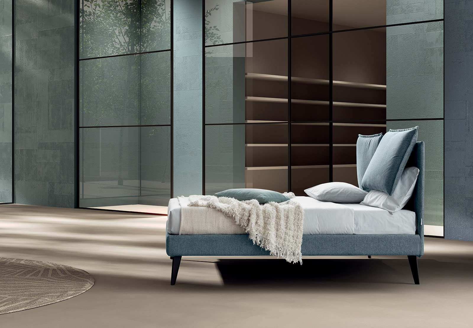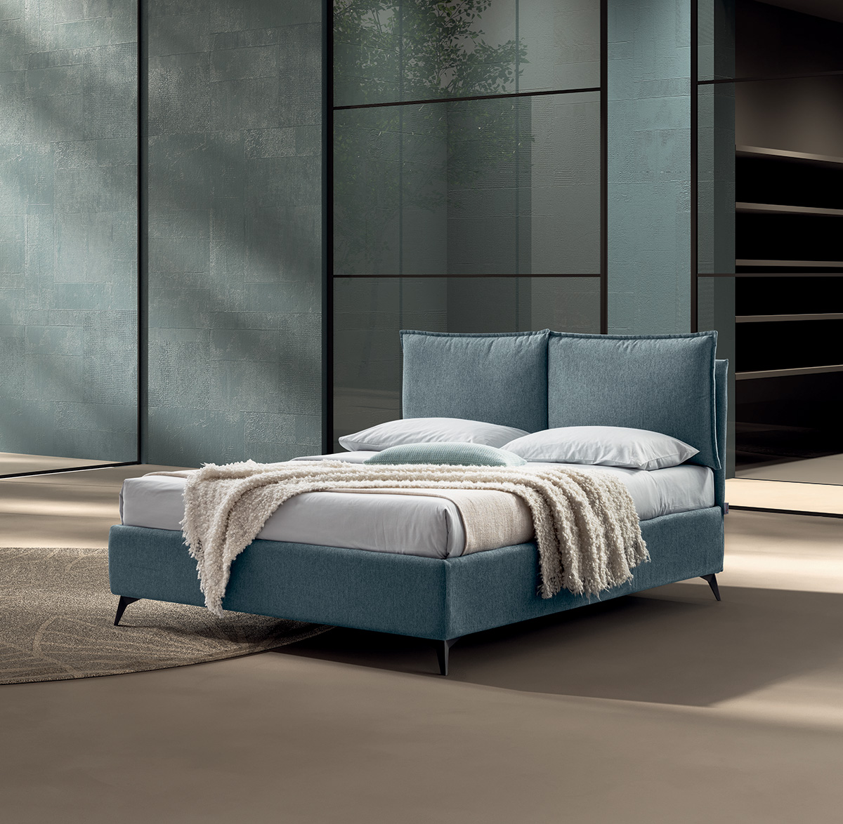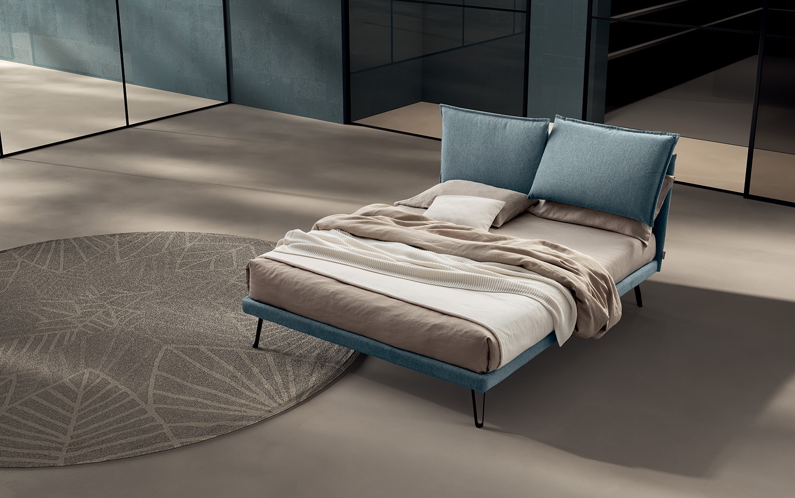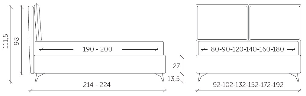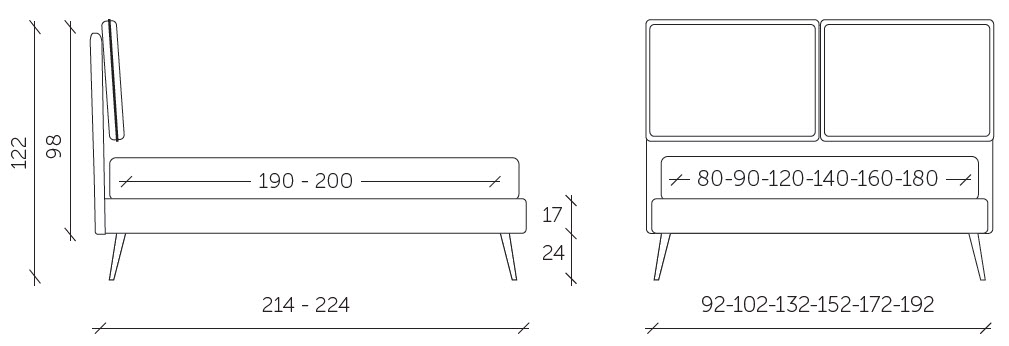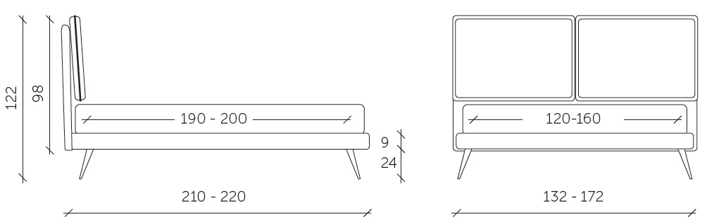 Bed base integrated into the frame, and is available as standard both in 160 cm double and 120 cm small double versions; the extendible joints between the bed base and the headboard, which can be lengthened by up to 10 cm, enable mattresses from 190 cm to 200 cm in depth to be used (in the version with a 190 cm bed base) or mattresses from 200 cm to 210 cm in depth in the version with a 200 cm bed base. In the “structural bed base” version, different feet are available as an option: wood, and metal.