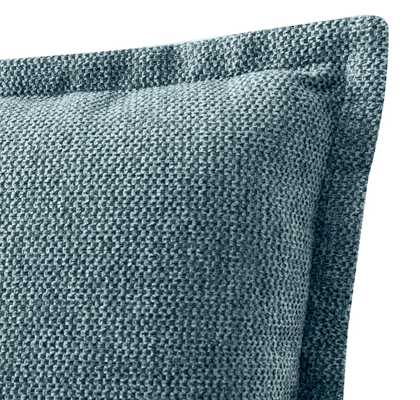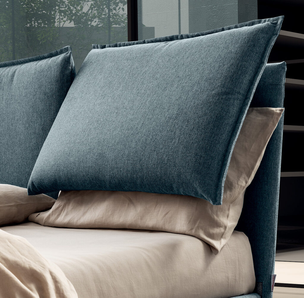 Detail of the headboard characterised by the inclined structure and the two soft cushions with a border around the edge.