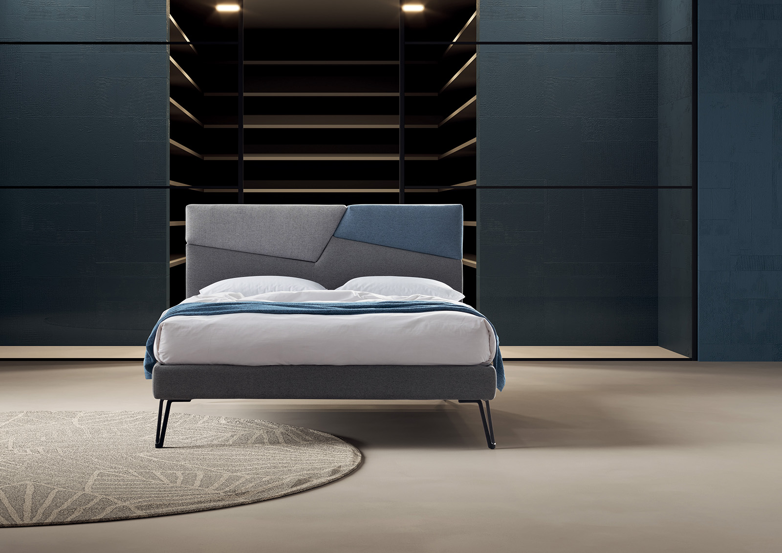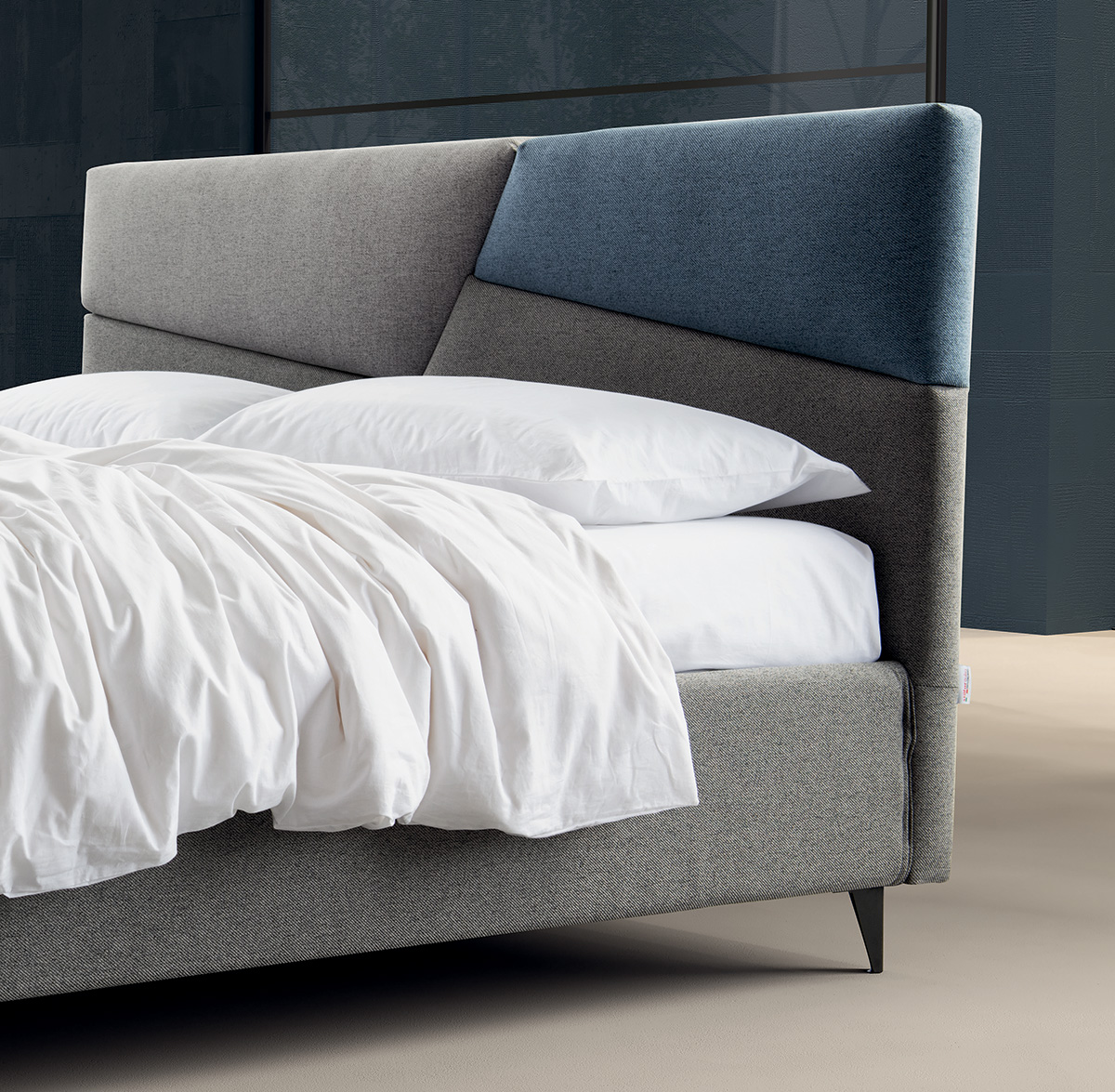 This bed features a headboard characterised by three soft upholstered multicoloured panels in geometric shapes, which enhance the look of the bed; the panels can be produced in various colours, selecting from the different upholstery options in the sample book.